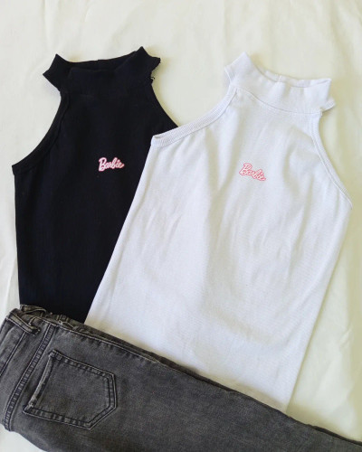 تاپ زنانه یقه هالتری برچسب باربی نخ پنبه کبریتی